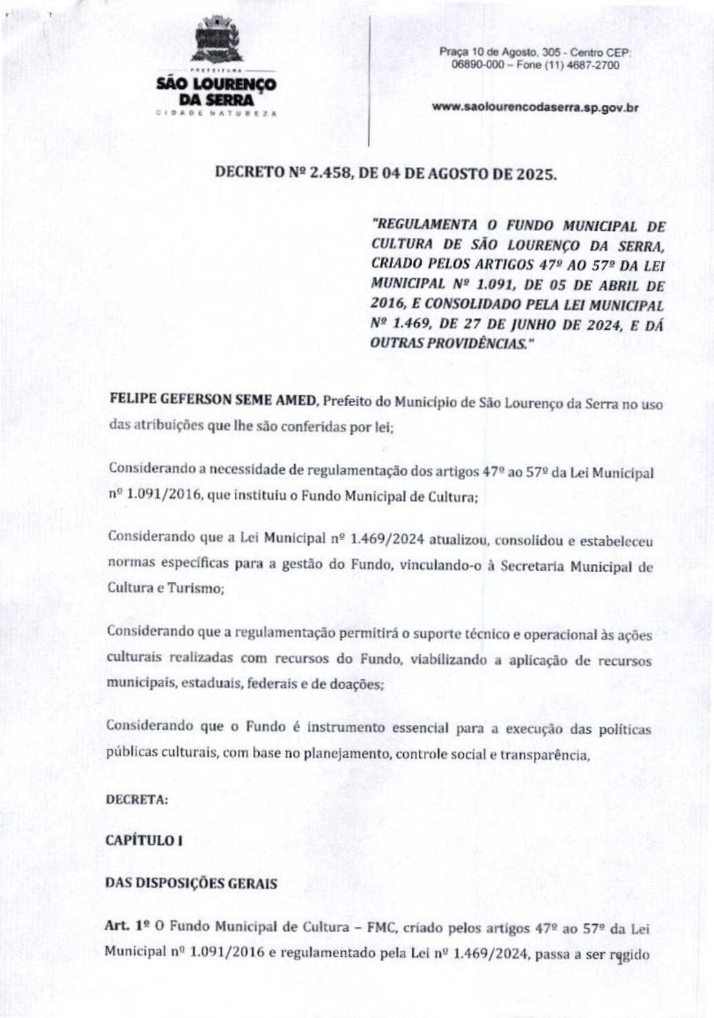 “REGULAMENTA O FUNDO MUNICIPAL DE CULTURA DE SÃO LOURENÇO DA SERRA, CRIADO PELOS ARTIGOS 47º AO 57º DA LEI MUNICIPAL N 1.091, DE 05 DE ABRIL DE 2016, E CONSOLIDADO PELA LEI MUNICIPAL № 1.469, DE 27 DE JUNHO DE 2024, E DÁ OUTRAS PROVIDÊNCIAS.”