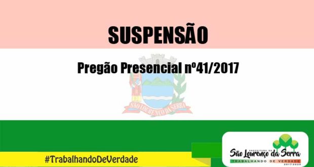 O Pregoeiro do Município de São Lourenço da Serra torna público que o pregão nº 041/2017 “Registro de preços para o fornecimento parcelado de materiais escolares, para distribuição gratuita aos alunos da rede municipal” está SUSPENSO “sine die”, determinação do tribunal de contas até apreciação final da matéria ora impugnada.