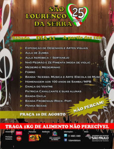 Confira a Programação Completa da comemoração do Aniversário de 25 anos de São Lourenço da Serra, que acontece nos dias 11, 12 e 13 de março: